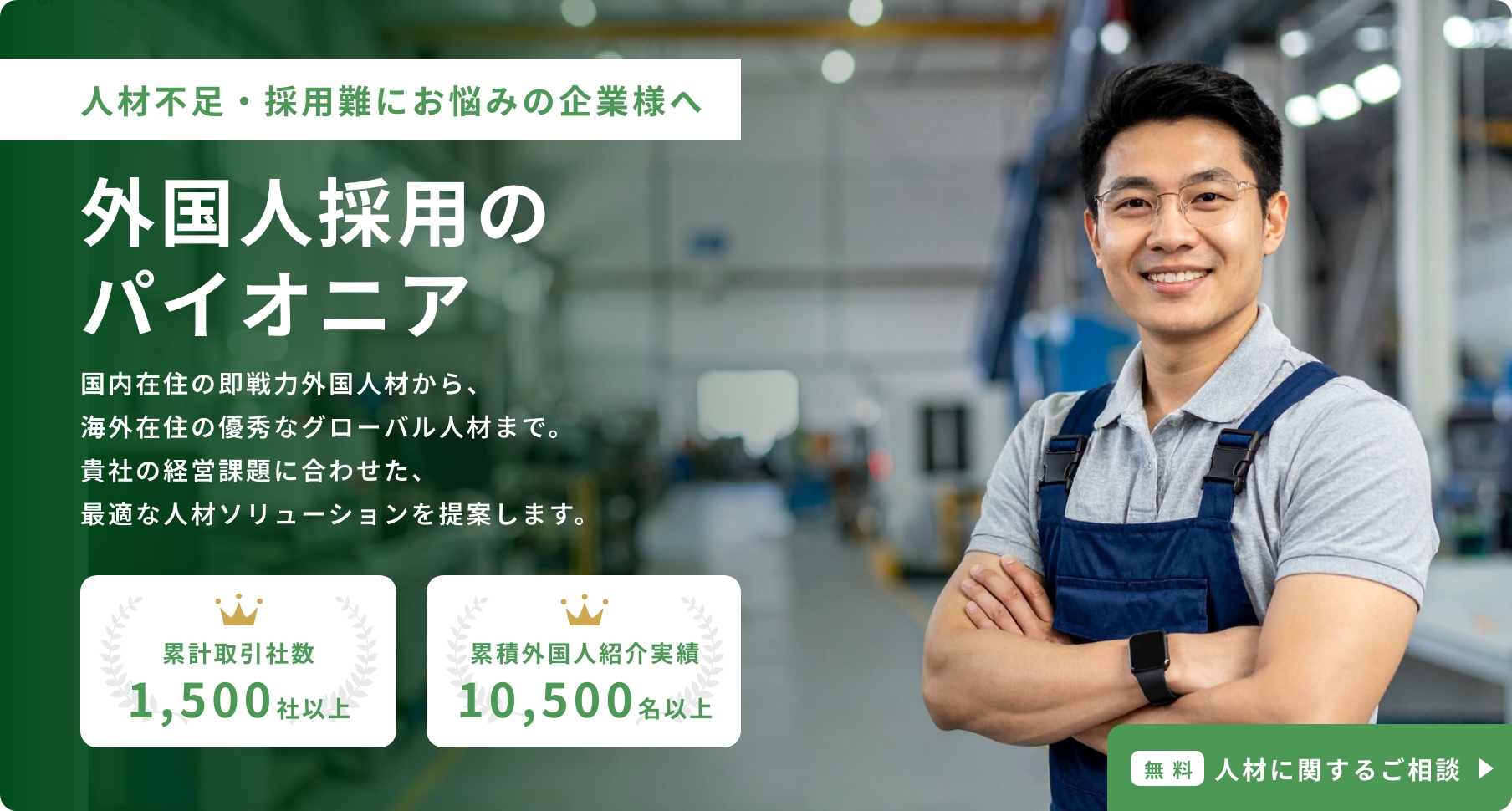 製造、介護、宿泊などの現場で即戦力となる特定技能外国人を採用から定着までサポートします。ベトナム・インドネシアをはじめとする真面目で勤勉な人材をご紹介し、現場の人手不足を解消します。