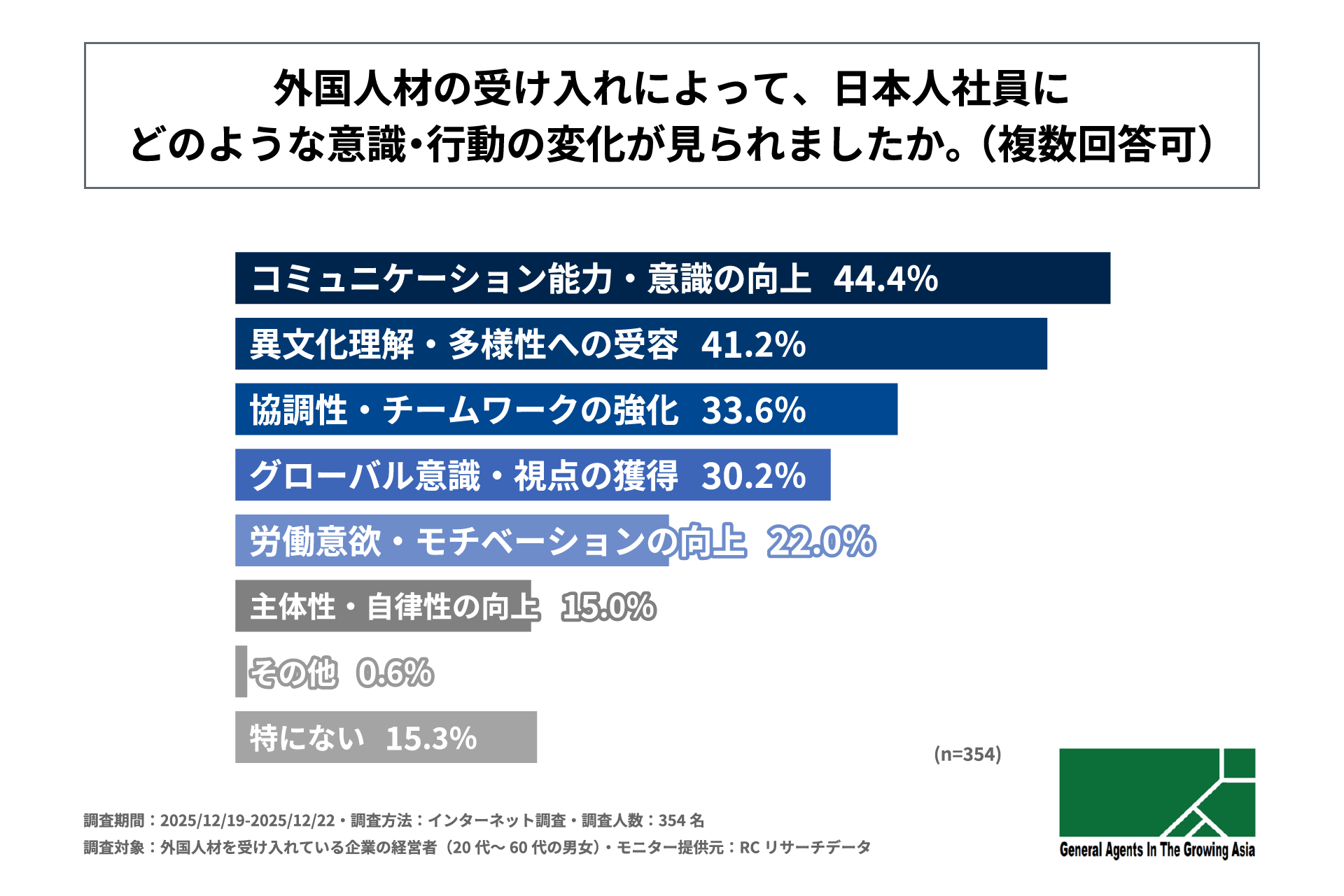 続いて「外国人材の受け入れによって、日本人社員にどのような意識・行動の変化が見られたか」を尋ねる設問への回答では、1位が「コミュニケーション能力・意識の向上」で44.4%、2位が「異文化理解・多様性への受容」で41.2%、3位が「協調性・チームワークの強化」で33.6%という結果になりました。この結果から、外国人材の受け入れによって、日本人社員に起きた主な意識・行動の変化は「コミュニケーション能力・意識の向上」や「異文化理解・多様性への受容」であることが判明しました。
