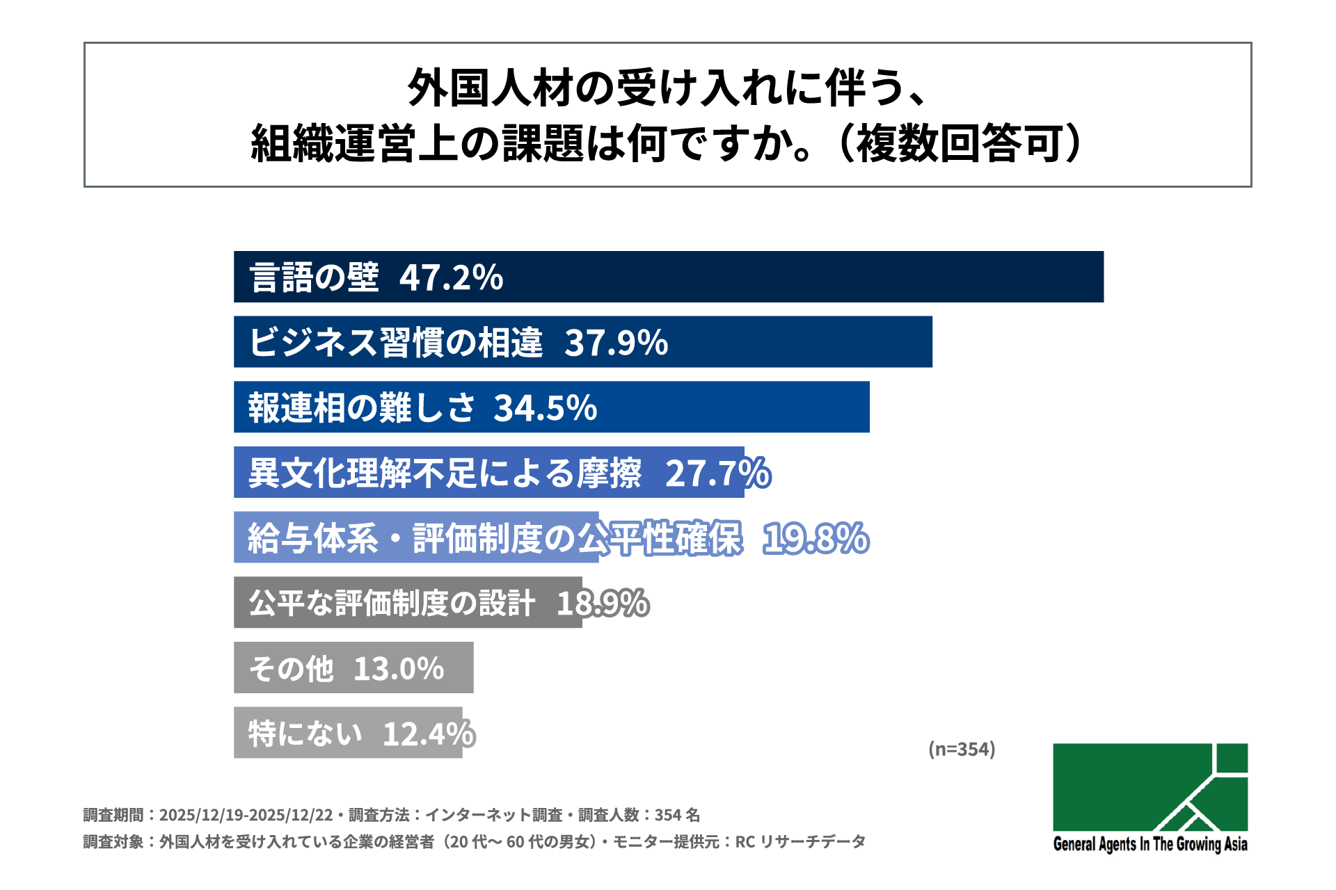 また「外国人材の受け入れに伴う、組織運営上の課題は何か」を尋ねる設問への回答では、1位が「言語の壁」で47.2%、2位が「ビジネス習慣の相違」で37.9%、3位が「報連相の難しさ」で34.5%という結果になりました。この結果から、外国人材の受け入れに伴う、組織運営上の最も大きな課題は「言語の壁」であることが明らかになりました。