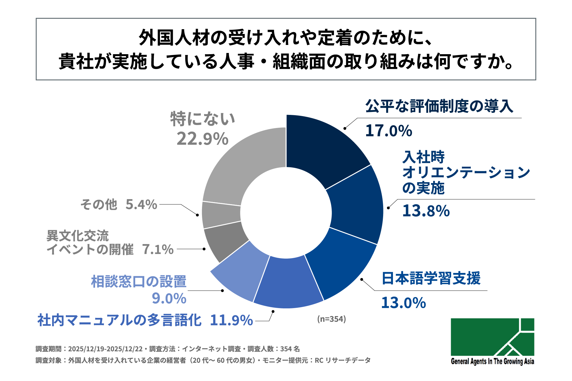 調査の最後、「外国人材の受け入れや定着のために、自社で実施している人事・組織面の取り組みは何か」を尋ねる設問への回答では、1位が「特にない」で22.9%、2位が「公平な評価制度の導入」で17.0%、3位が「入社時オリエンテーションの実施」で13.8%という結果になりました。「特にない」という回答が最も多かったものの、この結果から、外国人材の受け入れや定着のために、会社として実施している人事・組織面での主な取り組みは「公平な評価制度の導入」や「入社時オリエンテーションの実施」であることが明らかになりました。