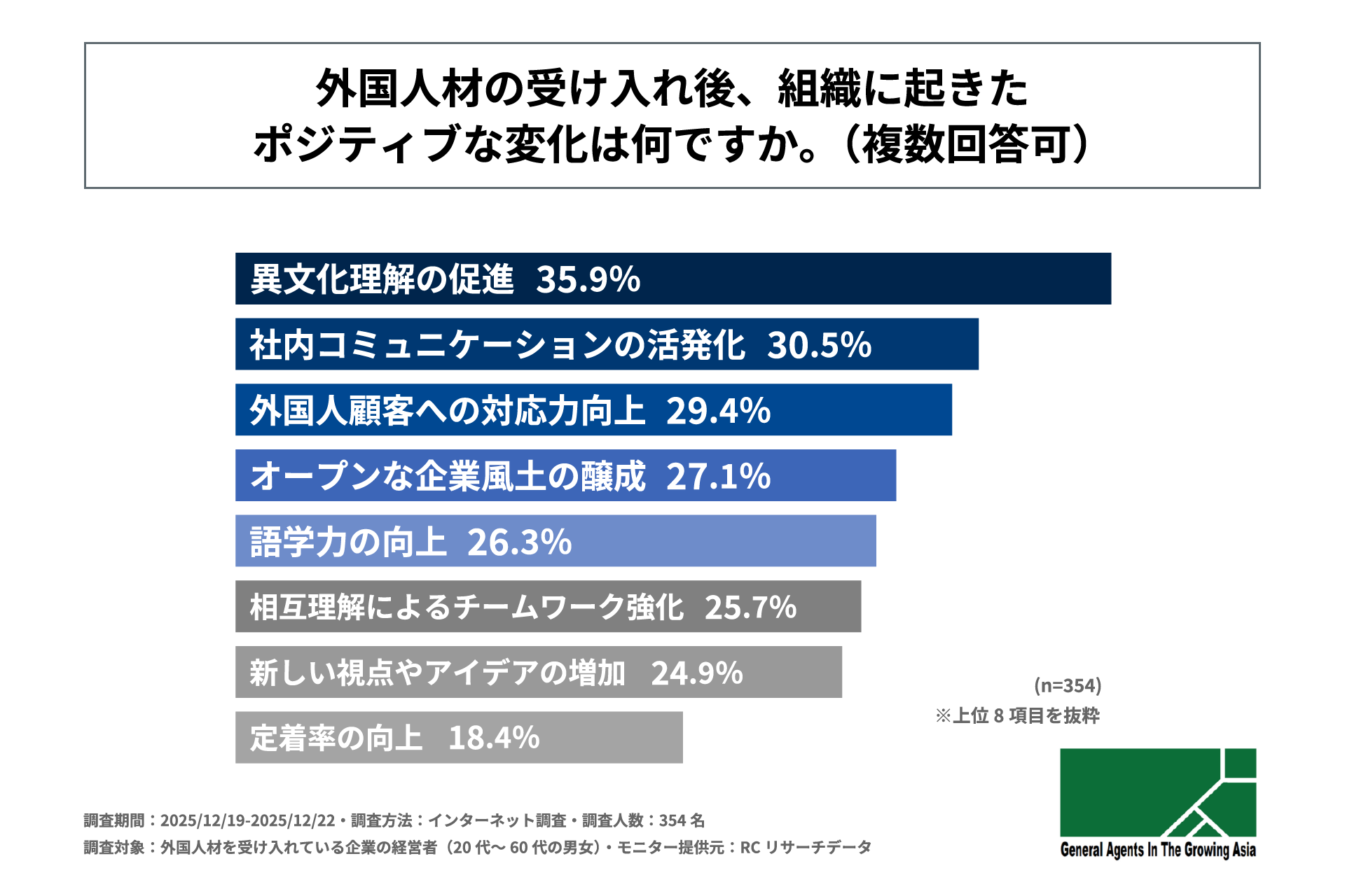 G.A.グループ株式会社(本社:東京都渋谷区、代表取締役:勝本 健司)は、外国人材を受け入れている企業の経営者(20代~60代の男女)を対象に「外国人材の受け入れによる組織の変化に関する実態調査」を実施しました。この調査から、外国人材の受け入れによって、企業の組織にどのような変化が起きているのか、その実態などが明らかになりました。