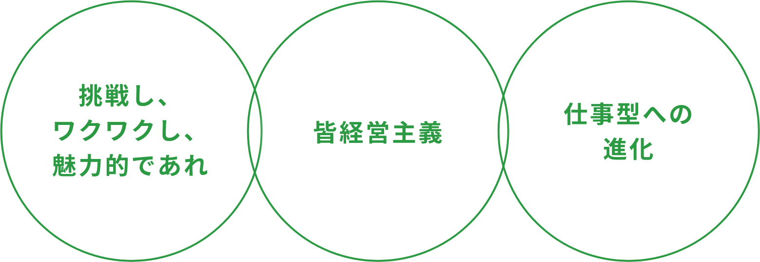 私たちが求めるのは「当事者意識」の高い人材です。何事にも自責思考で考えられ、成長機会を絶えず求められることを指します。一緒に働くメンバーに大事にして頂きたい考え方として、社是である「挑戦し、ワクワクし、魅力的であれ」、メンバー全員に経営視点を持ってもらいたいという「皆経営主義」、自身の仕事そのものに誇りとやりがいを持ってもらいたいという「仕事型への進化」があります。本当の自信は独りよがりなこだわりではなく、目の前の相手にしっかりと向き合い、自分の頭で徹底して考え、主体的に動くことから生まれます。孤立することを怖れずチャレンジし、自らのぶれない軸をもっている人に是非仲間に加わってほしいと思っています。