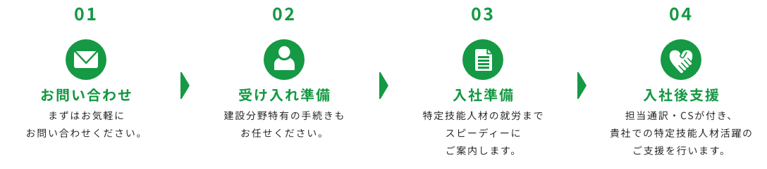 入職後も定期的に面談を行い、 特定技能者と受け入れ企業の フォローを行います