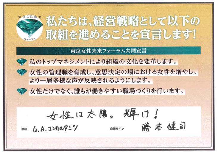 このたびG.A.コンサルタンツ株式会社は、東京都が運営する「東京女性リーダーズ応援ネットワーク」に賛同し、女性の活躍推進に向けた共同宣言を採択いたしました。